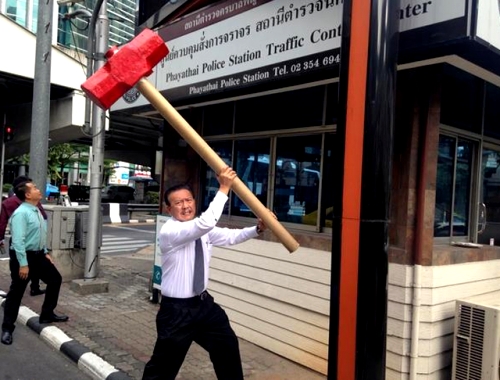 เมื่อเวลา 12.40 น. ที่ผ่านมา นายชูวิทย์ กมลวิศิษฎ์ หัวหน้าพรรครักประเทศไทย ได้นำค้อนยักษ์ไปทุบป้ายโฆษณาที่ตั้งอยู่บริเวณป้อมตำรวจพญาไท กรุงเทพฯ เพื่อเป็นการสื่อถึงผู้บัญชาการตำรวจนครบาล ในการเอาผิดกับตำรวจที่แสวงหาผลประโยชน์จากป้ายโฆษณาตามป้อมจราจร