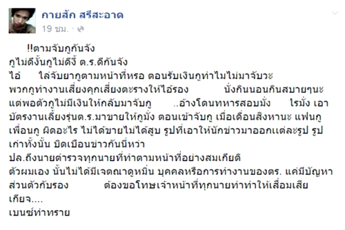 ปล.ถึงนายตำรวจทุกนายที่ทำตามหน้าที่อย่างสมเกียรติ ตัวผมเอง นั้นไม่ได้มีเจตนาดูหมิ่น บุคคลหรรือการทำงานของ ตร. แค่มีปัญหาส่วนตัวกับรอง (นายตำรวจคนหนึ่ง) ต้องขอโทษเจ้าหน้าที่่ทุกนายที่ทำให้เสื่อมเสียเกียรติ