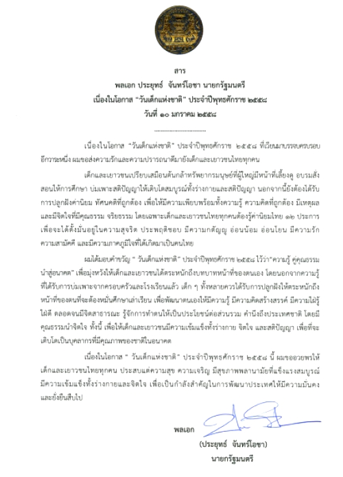วันเด็กแห่งชาติ 2558 พลเอกประยุทธ์ จันทร์โอชา นายกรัฐมนตรี ส่งสารถึงเยาวชนไทย