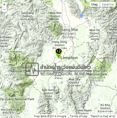 สำนักเฝ้าระวังแผ่นดินไหว รายงานว่า เมื่อเวลา 15.08 น. ของวันนี้ (12 ก.ย.57) เกิดแผ่นดินไหวขนาด 1.2 ตามมาตราริกเตอร์ ที่ อ.สันป่าตอง จ.เชียงใหม่ ทั้งนี้ไม่มีรายงานผลกระทบจากเหตุแผ่นดินไหวดังกล่าวเเต่อย่างใด