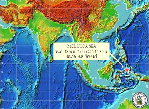 วันนี้ (18 พ.ย.) เมื่อเวลา 11.47 น. ตามเวลาในประเทศไทย เว็บไซต์กรมอุตุนิยมวิทยารายงานการเกิดแผ่นดินไหวในทะเล Molucca ใกล้ชายฝั่งทางตอนเหนือของประเทศอินโดนีเซีย มีขนาด 5.7 ตามมาตราริกเตอร์ ลึกจากพื้นดิน 52 กิโลเมตร และต่อมายังเกิดแผ่นดินไหวที่บริเวณเดิมถึง 3 ครั้ง วัดแรงสั่นสะเทือนได้ 4.9 ตามมาตราริกเตอร์ในเวลา 12.03 น. ขนาด 4.6 ตามมาตราริกเตอร์ เวลา 13.48 น. และขนาด 4.9 ตามมาตราริกเตอร์ในเวลา 15.30 น. เบื้องต้นยังไม่มีการเตือนภัยสึนามิและรายงานความเสียหายใดๆ