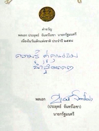 ที่ทำเนียบรัฐบาล สำนักนายกรัฐมนตรีได้เผยแพร่คำขวัญวันเด็กแห่งชาติประจำปี 2558 ของ พล.อ.ประยุทธ์ จันทร์โอชา นายกรัฐมนตรีและหัวหน้า คสช. ที่มอบคำขวัญวันเด็ก 2558 ให้แก่เด็กและเยาวชนไทย โดยคำขวัญวันเด็ก 2558 ดังกล่าวเขียนด้วยลายมือของ พล.อ.ประยุทธ์ ซึ่งคำขวัญวันเด็ก 2558 มีข้อความว่า "ความรู้ คู่คุณธรรม นำสู่อนาคต"