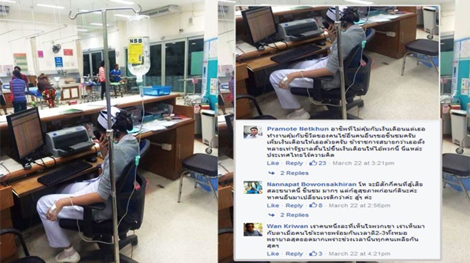 ภาพล่าสุดที่เผยแพร่ในเฟซบุ้ค "เหยี่ยวข่าว on Line"ได้โพสต์ภาพของ พยาบาลสาวรายหนึ่ง นั่งอยู่หน้าโต๊ะประชาสัมพันธ์โรงพยาบาล โดยมือซ้ายมีสายน้ำเกลือและเสาน้ำเกลือห้อยอยู่ พร้อมระบุข้อความว่า “อีกมุมหนึ่งของพยาบาลวิชาชีพ ที่ตัวเองป่วยแต่ชีวิตคนไข้ต้องฝากไว้กับเธอ”