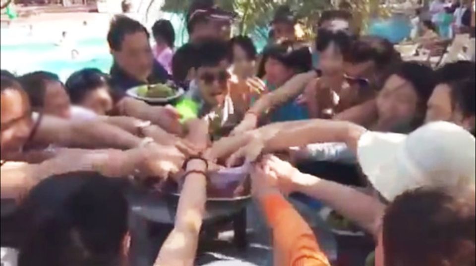 Chinese tourists clear out fruit plate in under six seconds at the poolside bar of a hotel in Vietnam.READ MORE: http://shst.me/fruitplate