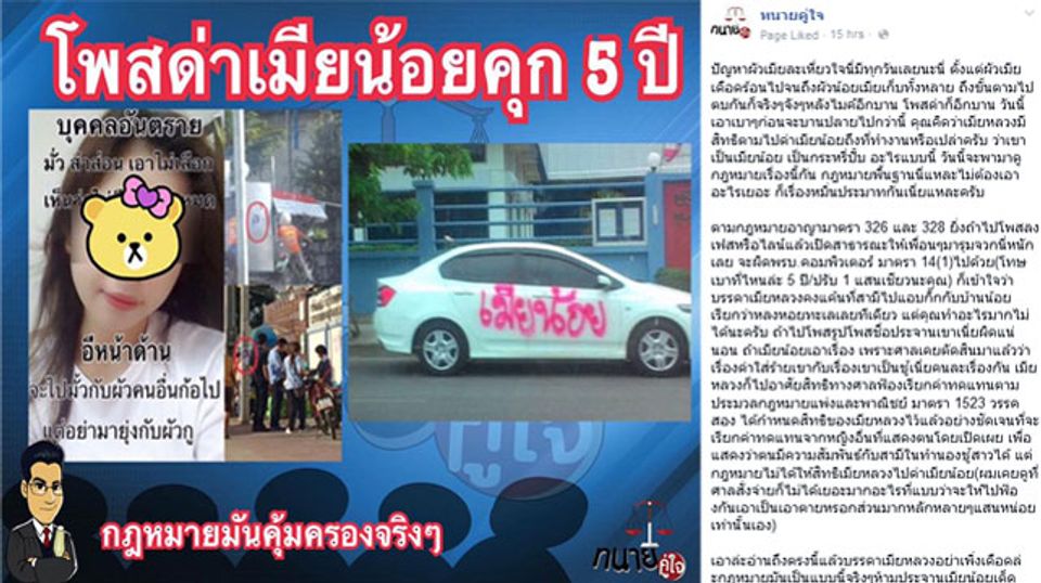 อย่างเช่นกรณีของเมียหลวงเมียน้อย ที่มักจะพบว่า เมียหลวงโพสต์ข้อความประจานเมียน้อย จนสร้างความอับอาย ซึ่งทางเพจทนายก็ระบุว่า การกระทำเช่นนี้ถือว่ามีความผิด ตาม มาตรา 14(1) ของ พ.ร.บ.คอมพิวเตอร์ ซึ่งมีโทษจำคุก 5 ปี หรือปรับ 100,000 บาท