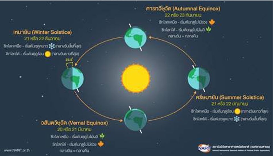 ดร. ศรัณย์ กล่าวเพิ่มเติมว่า โลกโคจรรอบดวงอาทิตย์เป็นรูปวงรี ทำให้ในรอบหนึ่งปี โลกจึงมีระยะห่างจากดวงอาทิตย์ไม่เท่ากัน ช่วงที่ใกล้ที่สุดประมาณต้นเดือนมกราคม (147 ล้านกิโลเมตร) ช่วงที่ไกลที่สุดประมาณต้นเดือนกรกฎาคม (152 ล้านกิโลเมตร) การโคจรของโลกรอบดวงอาทิตย์ที่มีระยะใกล้บ้าง ไกลบ้าง นั้น เมื่อเปรียบเทียบความแตกต่างของใกล้-ไกล ถือเป็นอัตราส่วนที่น้อยมากจึงไม่มีผลต่อการเกิดฤดูกาลแต่อย่างใด แต่การที่แกนของโลกเอียง 23.5 องศา เมื่อโลกโคจรรอบดวงอาทิตย์ ทำให้ตำแหน่งขั้วโลกเหนือหรือขั้วโลกใต้หันเข้าหาดวงอาทิตย์ ส่วนต่างๆ ของโลกจึงได้รับแสงอาทิตย์ไม่เท่ากัน ทำให้มีอุณภูมิต่างกัน จึงเกิดเป็นฤดูกาลต่าง ๆ ขึ้น