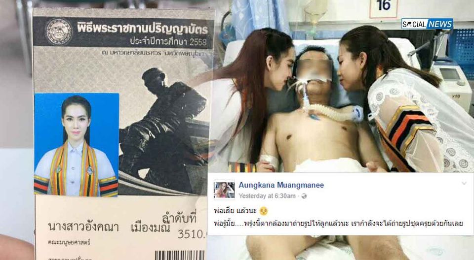 โดยในเฟซบุ้ค Aungkana Muangmanee โพสต์ภาพบัณฑิตหญิง 2 คน ขณะก้มลงหอมแก้มชายรายหนึ่งที่กำลังนอนป่วย และมีอุปกรณ์ทางการแพทย์ช่วยเหลือ ก่อนจะเผยข้อความอันน่าเศร้าว่า