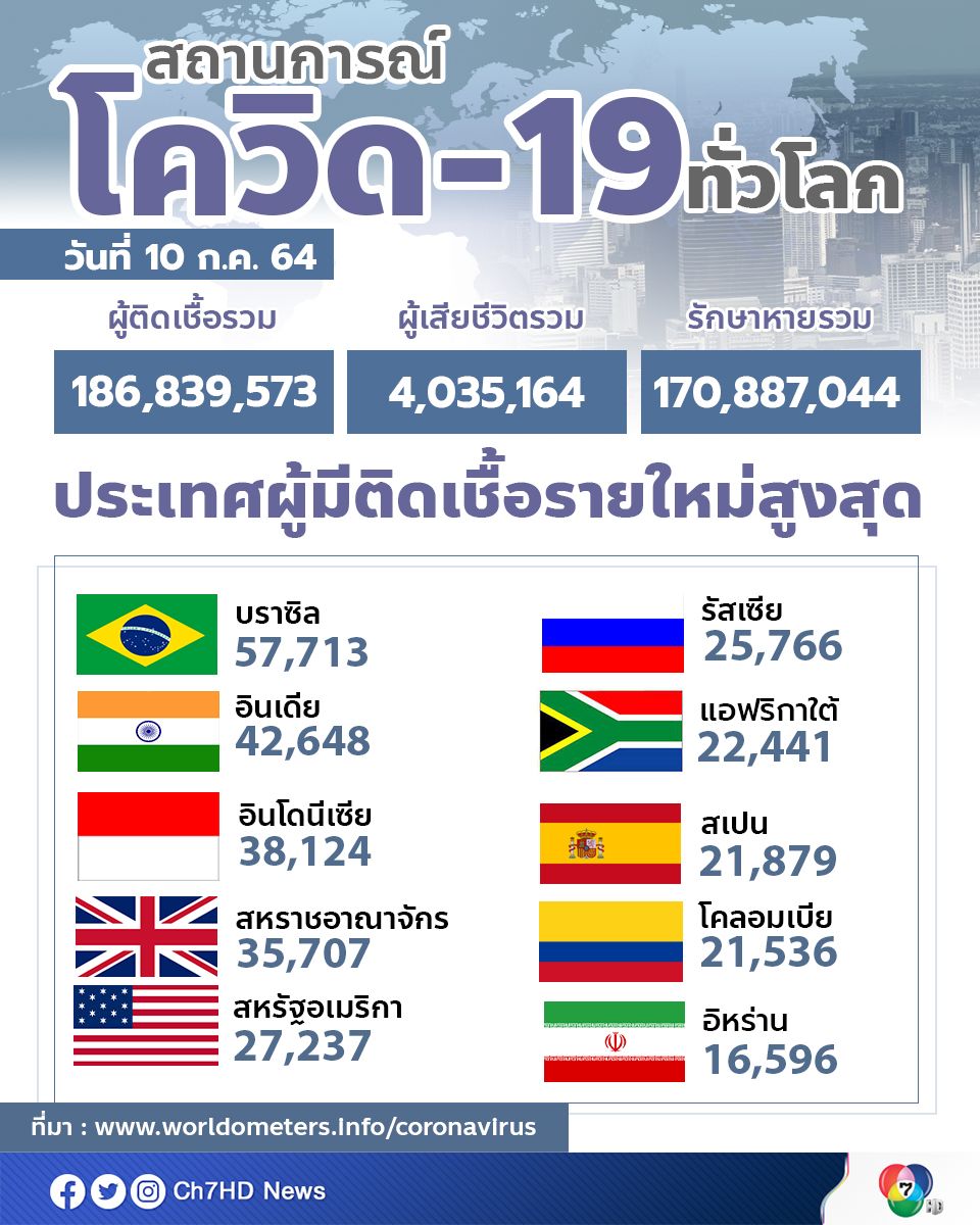 ขณะที่ ไทยอยู่อันดับที่ 16 ประเทศที่มีผู้ติดเชื้อรายวันสูงสุดของโลก และประเทศที่มียอดผู้ติดเชื้อยืนยันสะสม 3 อันดับสูงสุดยังคงเป็นสหรัฐฯ อินเดีย และบราซิล