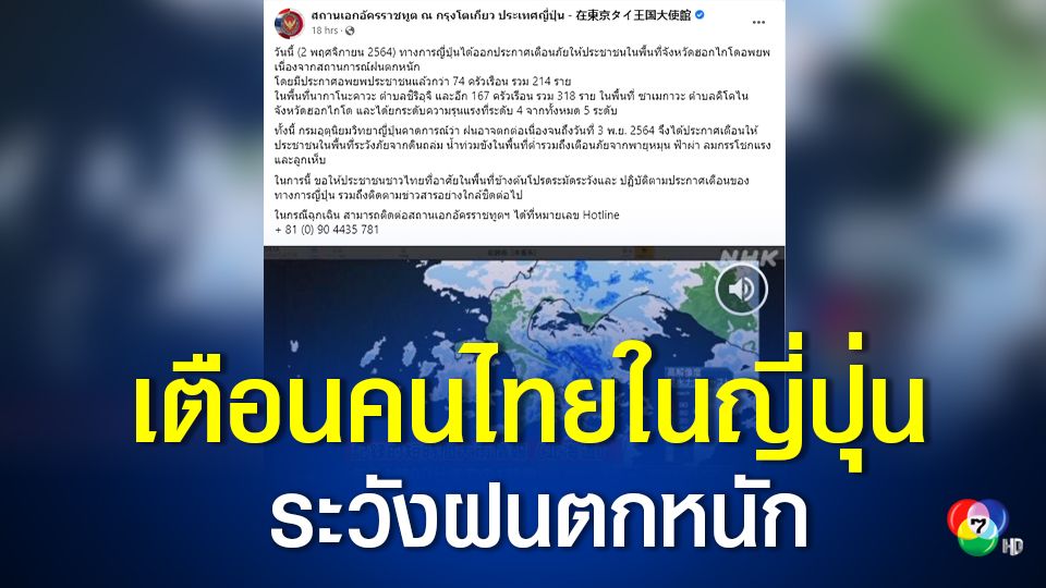 กรมอุตุนิยมวิทยาญี่ปุ่น คาดการณ์ว่า ฝนอาจตกต่อเนื่องจนถึงวันนี้ (3พ.ย.64) จึงได้ประกาศเตือนให้ประชาชนในพื้นที่ระวังภัยจากดินถล่ม น้ำท่วมขังในพื้นที่ต่ำรวมถึงเตือนภัยจากพายุหมุน ฟ้าผ่า ลมกรรโชกแรง และลูกเห็บ ขอให้ประชาชนชาวไทยที่อาศัยในพื้นที่ข้างต้นโปรดระมัดระวังและปฏิบัติตามประกาศเตือนของทางการญี่ปุ่น รวมถึงติดตามข่าวสารอย่างใกล้ชิด