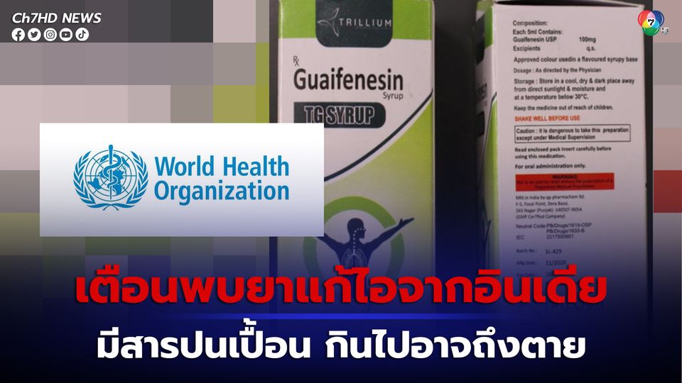 องค์การอนามัยโลก (WHO) เตือนพบยาแก้ไอที่ผลิตจากบริษัทของอินเดีย มีสารปนเปื้อนที่เป็นพิษต่อมนุษย์ และอาจทำให้ถึงกับเสียชีวิตหากรับประทานเข้าไป