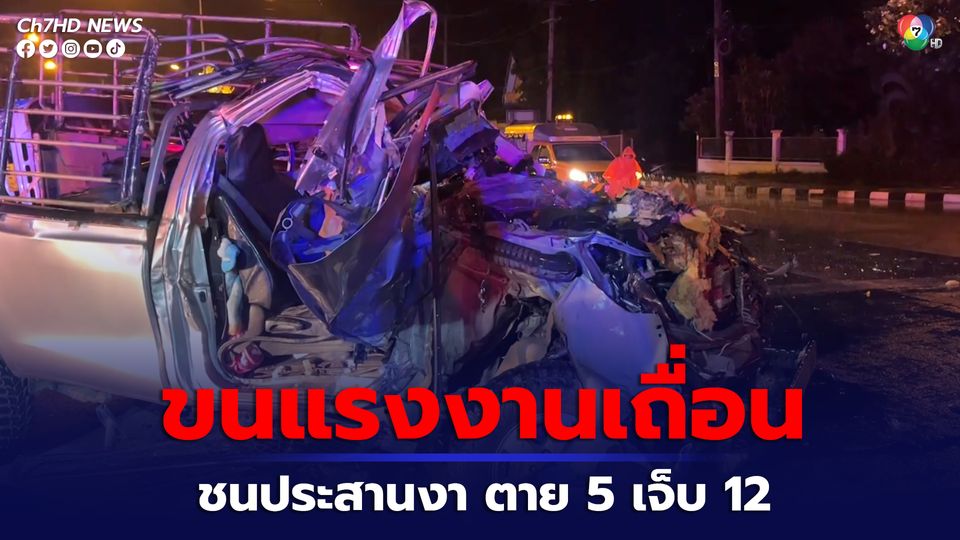 รถกระบะขนแรงงานเถื่อนไปไม่ถึงปลายทาง จ.ชลบุรี ชนประสานงารถบรรทุก แรงงานกระเด็นออกจากรถ ตาย 5 เจ็บสาหัส 12 คน เบื้องต้นคนขับรถบรรทุกยอมรับว่าวูบหลับใน ไม่แน่ใจสัญญาณไฟจราจรเป็นอย่างไร