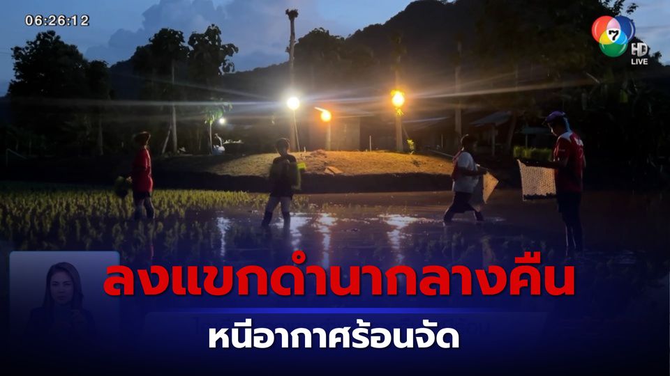 เป็นภาพชาวนาที่บ้านโนนผาพุงพัฒนา ตำบลเขาหลวง อำเภอวังสะพุง จังหวัดเลย เปิดไฟส่องสว่างลงไปที่ทุ่งนา ก่อนจะช่วยกันโยนต้นกล้าลงในนาข้าว