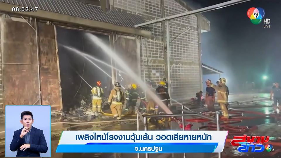 สนามข่าว 7 สี - เกิดเหตุการณ์ระทึกเพลิงไหม้โรงงานผลิตวุ้นเส้นในจังหวัดนครปฐม เป็นโรงงานอุตสาหกรรมขนาดใหญ่ถูกเปลวเพลิงเผาไหม้วอด ภายในมีเครื่องจักรและวัตถุดิบในการผลิตจำนวนมาก มีความเสียหายอย่างหนัก ยังไม่สามารถประเมินมูลค่าได้