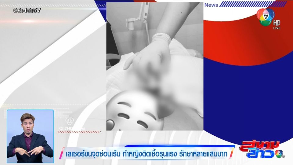 สนามข่าว 7 สี - ข่าวนี้เรามาเตือนภัยสาว ๆ ที่รักสวยรักงามกันหน่อย แน่นอนว่าการรักสวยรักงามเป็นเรื่องที่ดี แต่ปัจจุบันนี้ก็ต้องระมัดระวัง เพราะกรณีล่าสุด มีหญิงคนหนึ่งไปเลเซอร์ขนลับ แต่ปรากฎว่า เธอดันเกิดอาการแพ้ติดเชื้อรุนแรง จนต้องเข้าแอดมิตนอนโรงพยาบาล 2 คืน เสียค่ารักษาไปกว่า 100,000 บาท แถมคลินิกไม่ออกมาแสดงความรับผิดชอบแต่อย่างใด