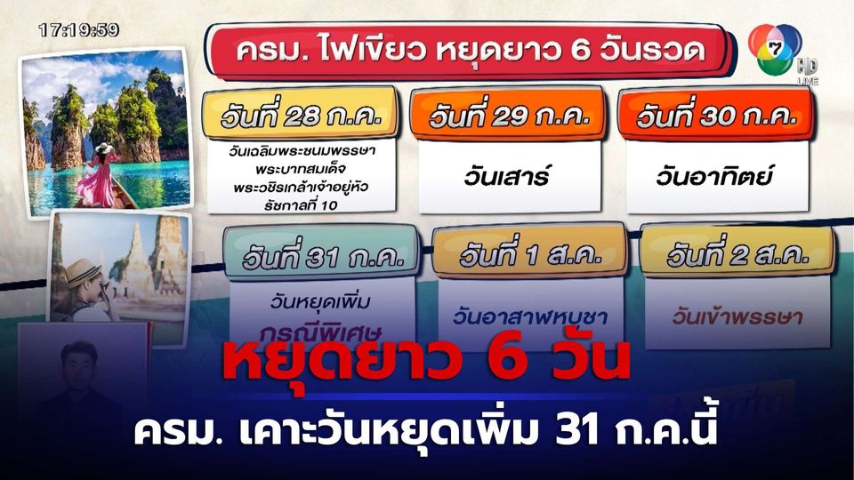 ข่าวเย็นประเด็นร้อน - ครม. เคาะ "วันหยุด" เพิ่มอีก 1 วัน ทำให้เดือนกรกฎาคมนี้ ที่มีวันหยุดยาว 4 วันต่อเนื่อง วันหยุดเดือนสิงหาคม รวม 6 วัน