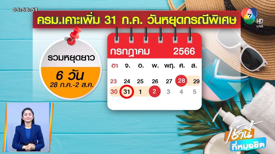 เช้านี้ที่หมอชิต - มติที่ประชุมคณะรัฐมนตรี เห็นชอบเพิ่ม 31 กรกฎาคม 2566 เป็นวันหยุดราชการเพิ่มเป็นกรณีพิเศษอีก 1 วัน ส่งผลให้มีวันหยุดยาวติดต่อกัน 6 วัน ตั้งแต่วันที่ 28 กรกฎาคม -2 สิงหาคม