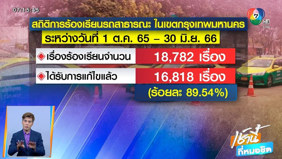 จากเรื่องร้องเรียน 18,782 เรื่อง พบว่าได้รับการแก้ไขไปแล้ว 16,818 เรื่อง หรือคิดเป็นร้อยละ 89.54 เปอร์เซ็นต์ แต่ปัญหาข้อร้องเรียนต่าง ๆ เหล่านี้คงจะไม่หมดไปง่าย ๆ เพราะจากสภาพความเป็นจริง พบว่า รถแท็กซี่เถื่อนที่มักจะสร้างปัญหาจนนำมาสู่การร้องเรียนเป็นประจำ ยังมีอยู่เกลื่อนในกรุงเทพมหานคร