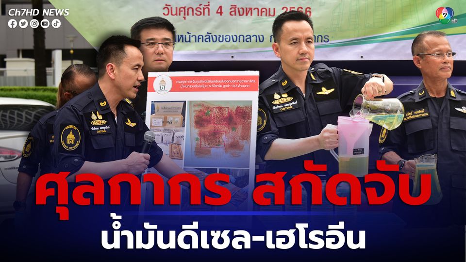 วันนี้ (วันที่ 4 ส.ค.66) นายพันธ์ทอง ลอยกุลนันท์ ที่ปรึกษาด้านการพัฒนาและบริหารการจัดเก็บภาษี ในฐานะโฆษกกรมศุลกากร เป็นประธานในการแถลงข่าวกรณีกรมศุลกากรจับกุมน้ำมันดีเซลจำนวน 114,000 ลิตร มูลค่า 3,641,160 บาท ลักลอบนำเข้ามาราชอาณาจักร และยึดเฮโรอีนเตรียมส่งออกนอกราชอาณาจักรซุกซ่อนอยู่ภายในซองแผ่นประคบร้อน น้ำหนักรวมสิ่งห่อหุ้ม 3.5 กิโลกรัม มูลค่า 10.5 ล้านบาท ณ บริเวณคลังของกลาง กรมศุลกากร