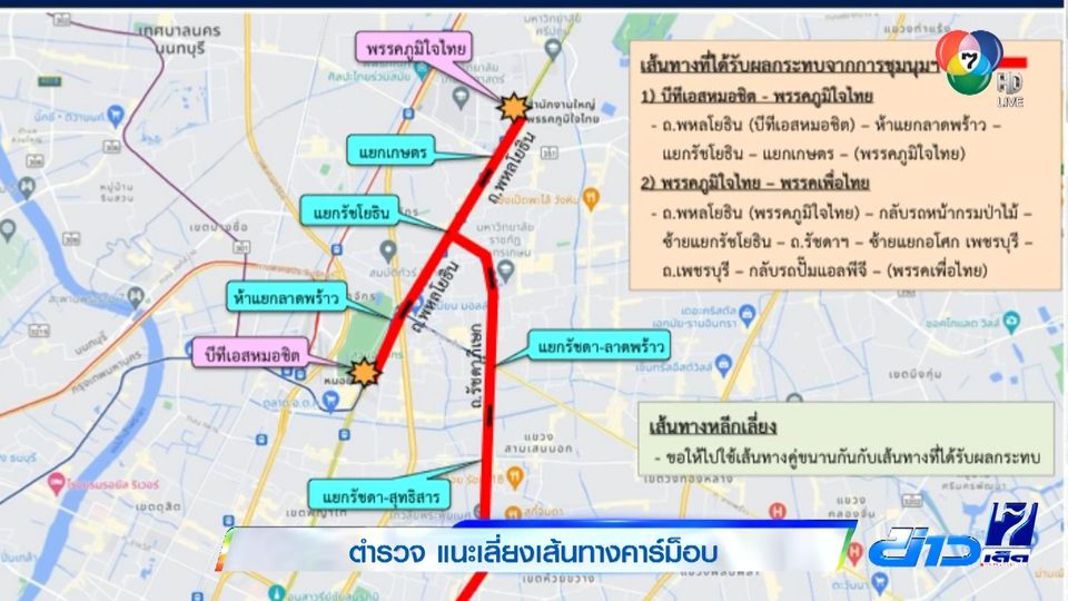 ข่าวเด็ด 7 สี - วันนี้ในช่วงเวลา 14.00 น. มีการนัดหมายของกลุ่มผู้ชุมนุมบริเวณสถานีรถไฟฟ้า บีทีเอส หมอชิต แล้วจะเคลื่อนตัวไปยังที่ทำการพรรคภูมิใจไทย ถนนพหลโยธิน และพรรคเพื่อไทย ถนนเพชรบุรีตัดใหม่ ในลักษณะคาร์ม็อบ ตำรวจนครบาลจึงขอให้ประชาชนหลีกเลี่ยงเส้นทางต่อไปนี้ ถนนพหลโยธิน จากหน้าสถานีรถไฟฟ้าบีทีเอส หมอชิต-ห้าแยกลาดพร้าว-แยกรัชโยธิน-แยกเกษตร-พรรคภูมิใจไทย และเส้นทาง พรรคภูมิใจไทย-พรรคเพื่อไทย ถนนเพชรบุรี ตั้งแต่เวลา 13.00 น. เป็นต้นไป