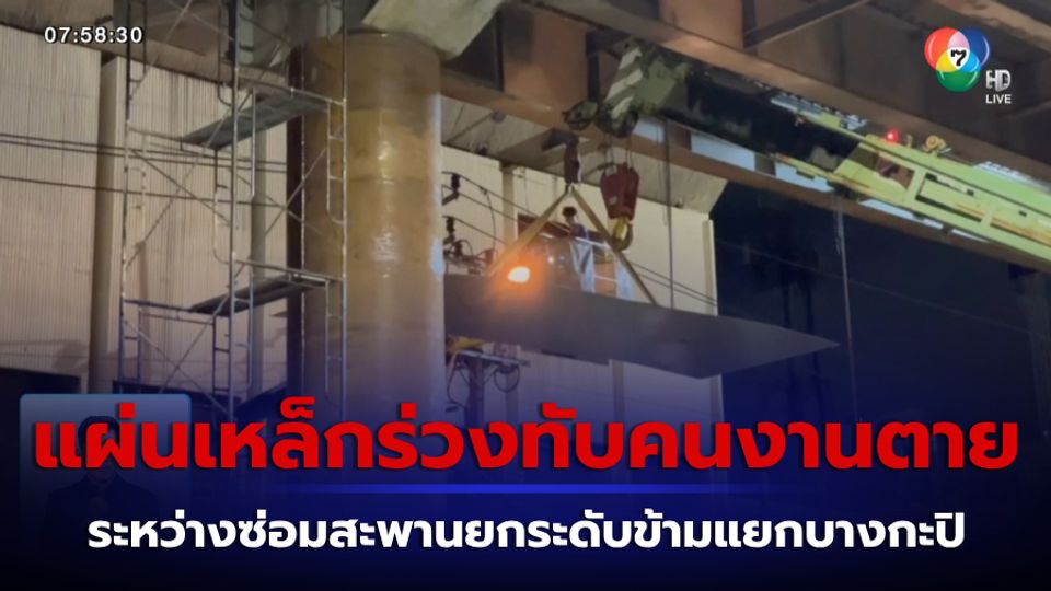 สนามข่าว 7 สี - เกิดอุบัติเหตุระหว่างการซ่อมแซมสะพานยกระดับข้ามแยกบางกะปิ ขณะกำลังรื้อถอนแผ่นเหล็กที่อยู่ใต้ท้องสะพาน ความยาวประมาณ 10 เมตร แล้วเกิดร่วงลงมา ทำให้ถูกคนงานที่กำลังทำงานได้รับบาดเจ็บ 2 คน และเสียชีวิตที่โรงพยาบาล 1 คน