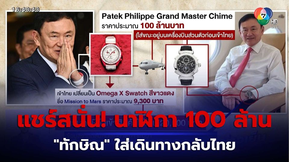 ข่าวเย็นประเด็นร้อน - ชาวโซเชียล สะดุดตานาฬิกาบนข้อมือ "ทักษิณ ชินวัตร" วันเดินทางกลับประเทศไทย นั่นคือ Patek Philippe Grandmaster Chime ที่ขึ้นชื่อว่าซับซ้อนที่สุดในโลก ราคาเหยียบหลัก 100 ล้านบาท