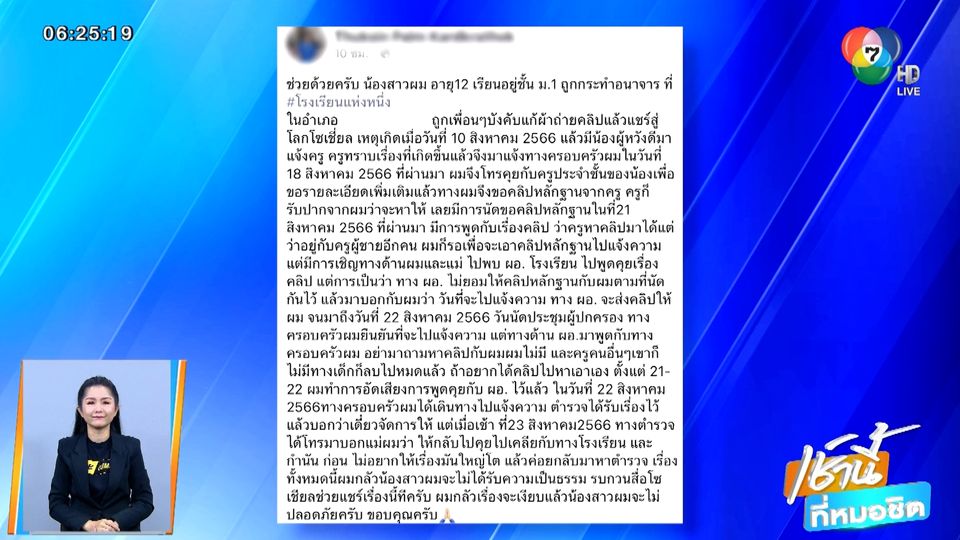 เช้านี้ที่หมอชิต - พี่ชายสุดทน น้องสาวเรียนชั้น ม.1 ถูกเพื่อนบังคับแก้ผ้าถ่ายคลิปแชร์ลงกลุ่ม หวั่นถูกเผยแพร่ลงโซเชียลเสียหาย
