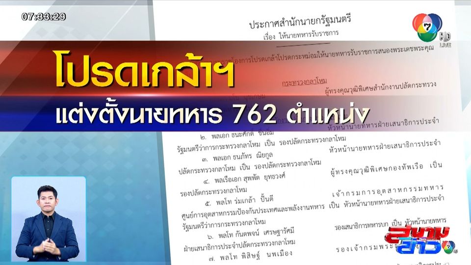 สนามข่าว 7 สี - มีพระบรมราชโองการโปรดเกล้าโปรดกระหม่อมแต่งตั้งให้นายทหารรับราชการ 762 ตำแหน่ง โดย พลเอก ทรงวิทย์ หนุนภักดี นั่งเก้าอี้ผู้บัญชาการทหารสูงสุด ขณะที่ พลเอก เจริญชัย หินเธาว์ เป็นผู้บัญชาการทหารบก