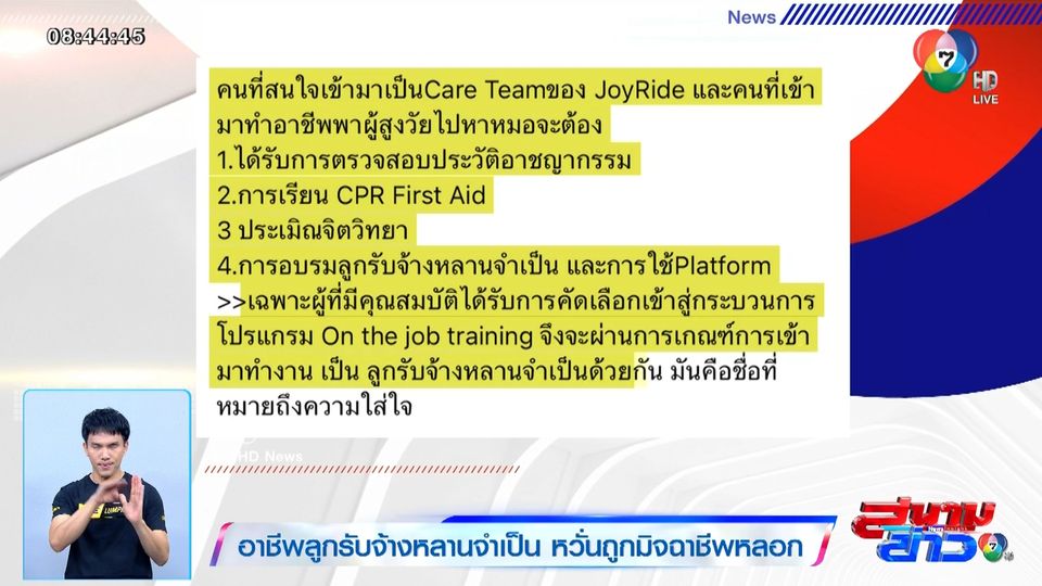 สรุปได้ว่า เพจต้องการให้คนที่จะไปใช้บริการอาชีพนี้ ต้องระมัดระวังเพราะอาจจะเจอมิจฉาชีพก็ได้ ซึ่งทางเพจ "Joy Ride Thailand ลูกรับจ้าง หลานจำเป็น พาผู้สูงอายุไปหาหมอ" เขาลงทุนสร้างเป็น Platform เลย ก็หวั่นว่า ถ้าคนที่ทำอาชีพนี้นำคำว่า "ลูกรับจ้างหลานจำเป็น" ไปใช้ ถ้าเกิดเป็นมิจฉาชีพ Platform ก็จะเสียหาย อีกทั้งจอยไรด์ คือ Strat up รับทุนจากภาษีของประชาชนมาพัฒนาให้เป็นนวัตกรรมเพื่อสังคม