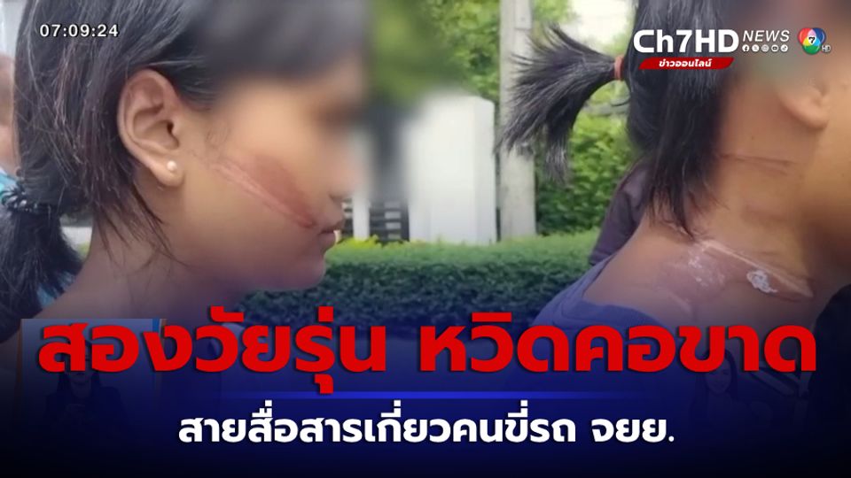 นายธาม อินทรประสาท อายุ 20 ปี โชว์บาดแผลบริเวณลำคอที่เป็นแผลฉกรรจ์ หลังจากขี่รถจักรยานยนต์ที่มีสาวอายุ 14 ปี ซ้อนท้าย แล้วถูกสายสื่อสารบริเวณหน้าหมู่บ้านใน หมู่ 5 ตำบลหนองขาม อำเภอศรีราชา จังหวัดชลบุรี เกี่ยวลำคอและใบหน้าจนเป็นแผลใหญ่