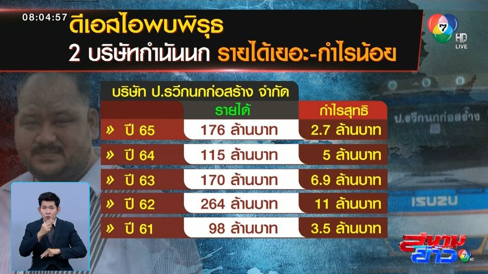 นอกจากนี้ ทีมข่าวของเรา ยังตรวจสอบเจาะไปที่โครงการใหญ่ เม็ดเงิน 100 ล้านบาทขึ้นไป กับ กองคดีความผิดเกี่ยวกับการเสนอราคาต่อหน่วยงานของรัฐ กรมสอบสวนคดีพิเศษ หรือ ดีเอสไอ ที่ก่อนหน้านี้ตรวจสอบประวัติทั้ง 2 บริษัทของ "กำนันนก" ย้อนหลังไปเมื่อปี 2558-2565 ก็พบว่า มีการประมูลงานก่อสร้างกว่า 1,000 โครงการวงเงินกว่า 3,500 ล้านบาท ซึ่งมีรายได้ไม่สอดคล้องกับงบดุลฯ และจุดสังเกตน่าสนใจ คือ มีรายได้เยอะ แต่กำไรน้อยมาก