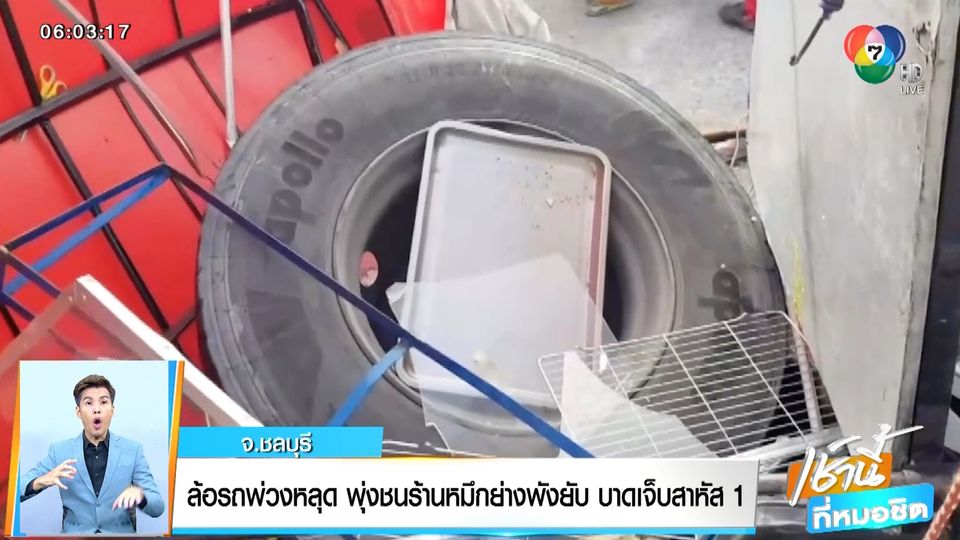 เช้านี้ที่หมอชิต - เกิดเหตุล้อรถบรรทุกพ่วงหลุดพุ่งเข้าร้านปลาหมึกย่างพังเสียหายยับ เจ้าของร้านบาดเจ็บสาหัส กล้องหน้ารถจับภาพนาทีเกิดเหตุไว้ได้