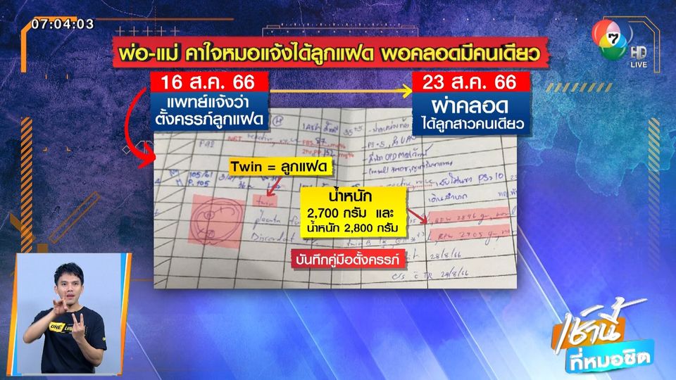 เช้านี้ที่หมอชิต - พ่อแม่คาใจ หมอแจ้งผลอัลตราซาวนด์ได้ลูกแฝด แต่พอครบกำหนดผ่าคลอด พบทารกเพียงคนเดียว จึงเรียกร้องให้โรงพยาบาลชี้แจง
