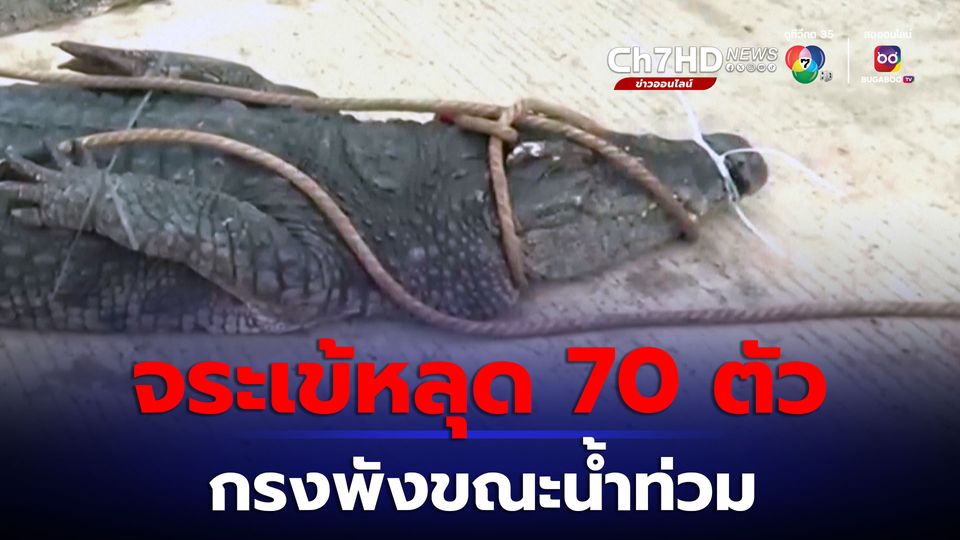 จระเข้ 70 ตัว หลุดออกจากฟาร์มใน มณฑลกวางตุ้ง ประเทศจีน ขณะเกิดน้ำท่วมทำให้ผนังกรงถล่มและเกิดช่องว่าง ขณะนี้จับได้แล้ว 36 ตัว