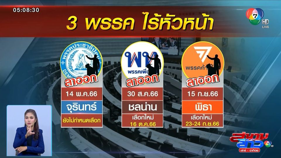 โดยในขณะนี้มี 3 พรรคการเมืองแล้ว ที่ไร้หัวหน้าพรรค ประกอบด้วย พรรคประชาธิปัตย์ พรรคเพื่อไทย และ พรรคก้าวไกล ซึ่งจากทั้ง 3 พรรคนี้ พรรคก้าวไกลจะได้หัวหน้าพรรคคนใหม่ก่อนเพื่อน แต่มีการกำหนดวันเลือกหัวหน้าและกรรมการบริหารพรรคใหม่แล้ว ในวันที่ 23 กันยายนนี้ จากนั้นจะเป็นพรรคเพื่อไทย ที่กำหนดวันเลือกหัวหน้าพรรคคนใหม่แทน นายแพทย์ ชลน่าน ศรีแก้ว ที่ลาออกไปในวันที่ 16 ตุลาคม