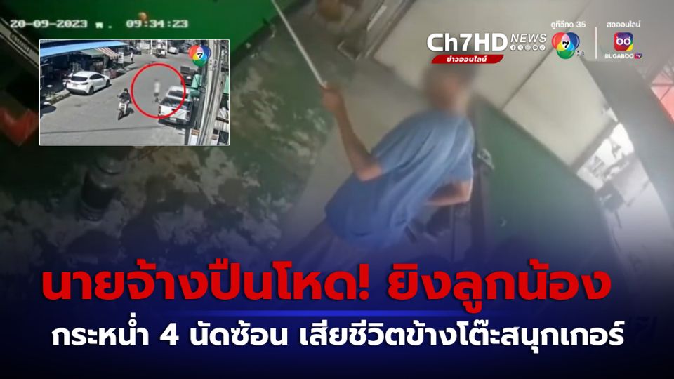 ข่าวเด็ด 7 สี - ภาพจากกล้องวงจรปิดบันทึกเหตุการณ์ เจ้าของอะพาร์ตเมนต์แห่งหนึ่ง ใช้อาวุธปืนยิงคนงาน 4 นัดซ้อน เสียชีวิตที่โต๊ะนั่งหินอ่อน ข้างโต๊ะสนุกเกอร์ ภายในซอยไทยประกัน ถนนเทพารักษ์ อำเภอบางเสาธง จังหวัดสมุทรปราการ ก่อนที่จะหลบหนีไป