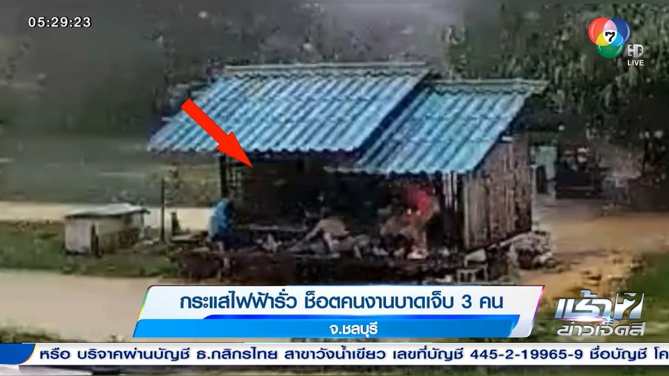 เช้าข่าว 7 สี - หนุ่มแรงงานประเทศเพื่อนบ้าน วิ่งเข้าไปหลบฝนในกระท่อมกลางสวน เอื้อมมือจับโครงเหล็กเสากระท่อม ถูกไฟฟ้าช็อตร่วงตกน้ำ เพื่อนคนงานอีก 2 คน ไม่รู้ วิ่งเข้าไปช่วย ก็ถูกไฟฟ้าช็อตไปอีก 2 คน เคราะห์ดีที่ตัดกระแสไฟฟ้าได้ทัน ทำให้คนงานทั้ง 3 คน เพียงแค่บาดเจ็บ