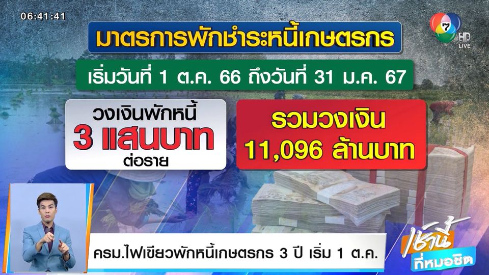 เช้านี้ที่หมอชิต - สำหรับมติ ครม. ที่น่าสนใจ เมื่อวานนี้ เกษตรกรได้ฟังคงใจชื้น รัฐบาลเคาะแล้ว พักหนี้เกษตรกร 3 ปี เริ่ม 1 ตุลาคม นี้