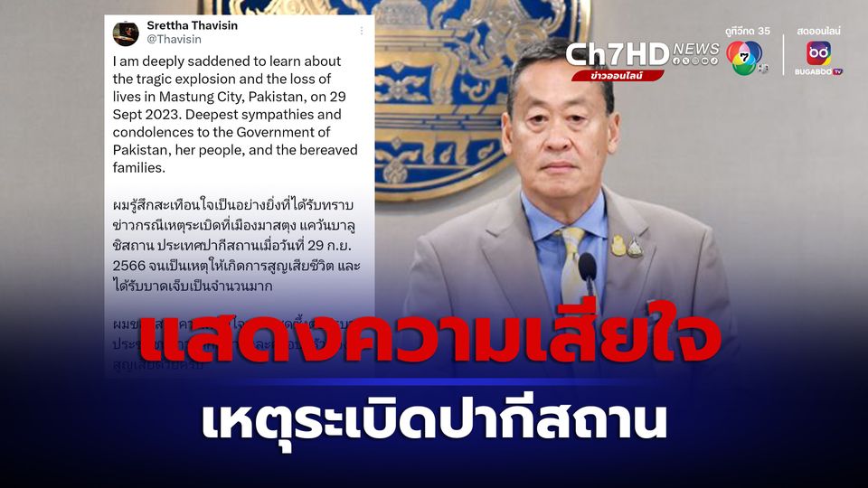 "ผมรู้สึกสะเทือนใจเป็นอย่างยิ่งที่ไดรับทราบข่าวกรณีเหตุระเบิดที่เมืองมาสตุง แคว้นบาลูชิสถาน ประเทศปากีสถานเมื่อวันที่ 29 ก.ย. 2566 จนเป็นเหตุให้เกิดการสูญเสียชีวิต และได้รับบาดเจ็บเป็นจำนวนมาก ผมขอแสดงความเสียใจอย่างสุดซึ้งต่อรัฐบาล ประชาชนชาวปากีสถานและครอบครัวของผู้สูญเสียด้วยครับ"
