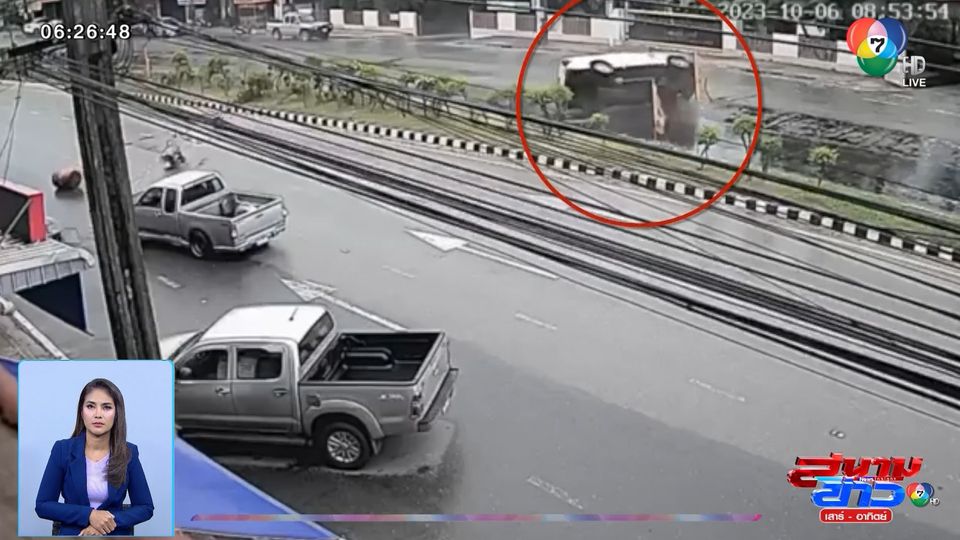 ภาพจากกล้องวงจรปิด บันทึกภาพของรถกระบะคันหนึ่ง ขับรถมาอยู่ดี ๆ เกิดเสียหลัก พลิกคว่ำหลายตลบ แล้วไปจอดนิ่งอยู่กลางถนนในสภาพพังเสียหาย ทำให้คนในรถได้รับบาดเจ็บ