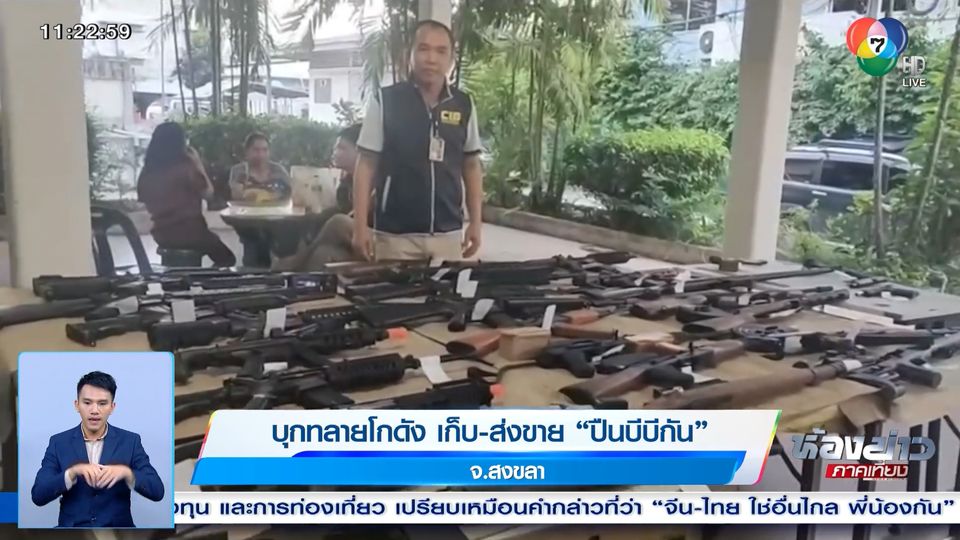 ห้องข่าวภาคเที่ยง - ยังคงมีการขยายผลจับกุมอาวุธปืน "แบลงก์กัน" - "บีบีกัน" อย่างต่อเนื่อง ล่าสุดตำรวจไปบุกค้นโกดังในอำเภอหาดใหญ่ จังหวัดสงขลา หลังตรวจสอบพบว่ามีการขายทางออนไลน์ ยึดของกลางเป็นปืนบีบีกันที่มีรูปแบบเป็นปืนกลมือ และปืนสั้นเกือบ 30 กระบอก