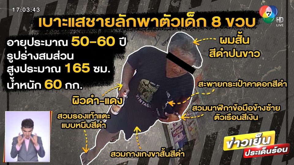 ข่าวเย็นประเด็นร้อน - คืบหน้าเด็กชายอายุ 8 ขวบ หายตัวปริศนา หลังยายพาไปรับข้าวสารแจกที่งานทิ้งกระจาดประจำปี จังหวัดสมุทรปราการ ล่าสุดพบเบาะแสคนร้ายที่ลักพาตัวน้องไปแล้ว เจ้าหน้าที่อยู่ระหว่างติดตามตัว