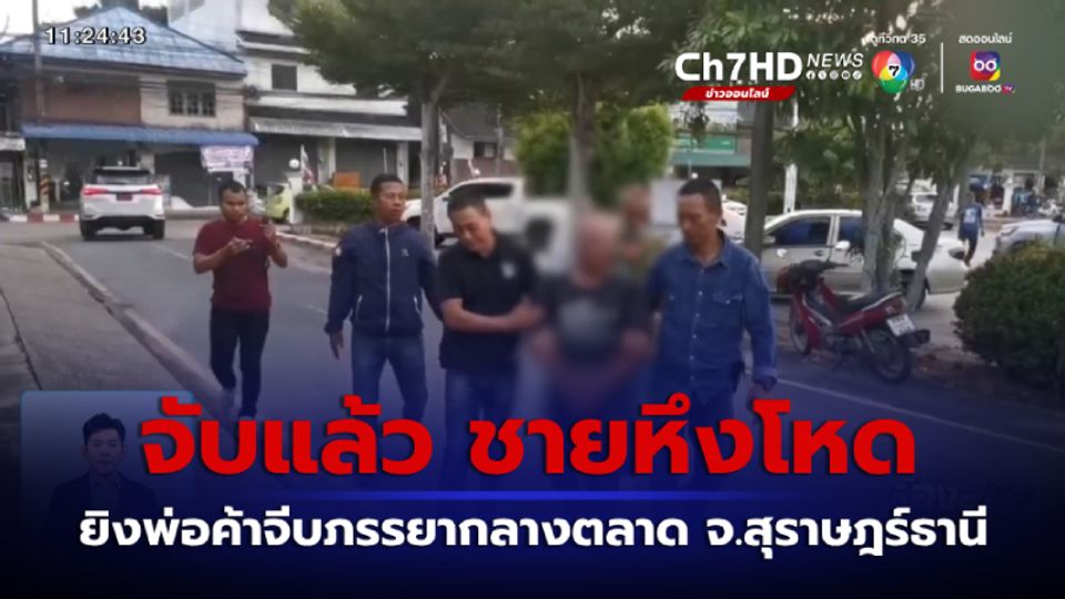 ห้องข่าวภาคเที่ยง - ความคืบหน้าคดีพ่อค้าตลาดสดจังหวัดสุราษฏร์ธานีหึงโหด ใช้ปืนไล่ยิงพ่อค้าในตลาดเดียวกันบาดเจ็บสาหัส หลังเข้าใจผิดคิดว่าแอบมาชอบพอภรรยาตัวเอง ล่าสุดตำรวจจับผู้ก่อเหตุได้แล้ว ขณะกำลังจะขึ้นรถไฟหลบหนีออกนอกพื้นที่