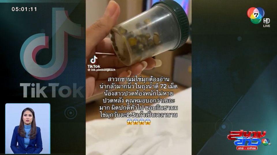 สนามข่าวเสาร์-อาทิตย์ - สาวกชานมไข่มุกต้องตั้งใจฟัง เมื่อพี่สาวของหญิงคนหนึ่งได้โพสต์เตือนในโซเชียล หลังน้องสาวดื่มชานมไข่มุกทุกวัน แล้วเกิดอาการปวดท้อง จึงไปหาหมอ ปรากฏว่าเจอนิ่วในถุงน้ำดีมากถึง 72 เม็ด