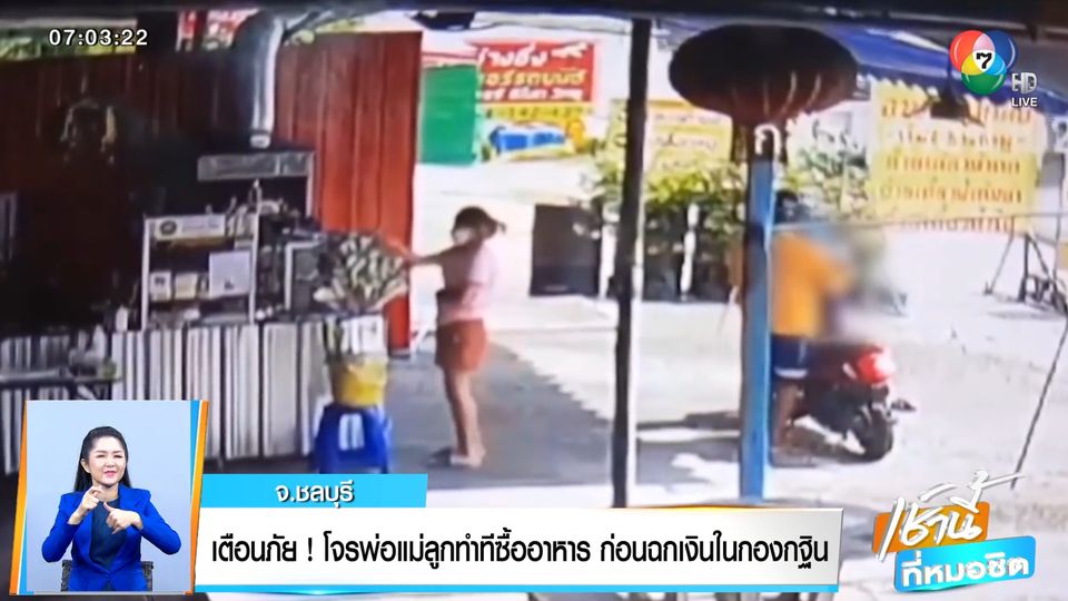 ผู้สื่อข่าวไปพบกับเจ้าของร้าน นางสาวธาริณี สมบูรณ์เงิน อายุ 32 ปี เจ้าของร้านตามสั่ง ในพื้นที่ หมู่ 2 ตำบลบ้านสวน อำเภอเมือง จังหวัดชลบุรี เปิดเผยว่า ช่วง 09.00 น. เมื่อวานนี้ มิจฉาชีพครอบครัวนี้แฝงตัวเป็นลูกค้า ขี่จักรยานยนต์กันมา ผู้เป็นแม่ได้ลงจากรถมาสั่งอาหารเป็นข้าวผัดทะเล 2 กล่อง ตนก็ทำให้โดยมีพ่อกับลูกนั่งรออยู่ที่รถซึ่งจอดหน้าร้าน ตนหันไปเห็นมีเด็กเล็กแถมจอดตากแดด จึงเรียกให้เข้ามาหลบในร้านแต่คนเป็นพ่อก็ไม่พาลงมา