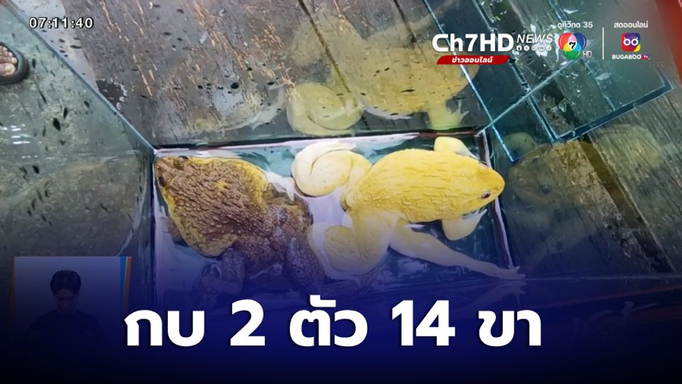 เช้านี้ที่หมอชิต - ช่วงใกล้สิ้นเดือน สัตว์ประหลาดต่าง ๆ ก็เริ่มปรากฎตัวให้เห็น ที่นครราชสีมา ฟาร์มเพาะพันธุ์กบเนื้อแห่งหนึ่ง นำกบ 2 ตัว ที่มีลักษณะพิเศษมาโชว์ เพราะมีทั้งหมด 14 ขา สีทองอร่าม แถมเลี้ยงมา 1 ปี ให้โชคลาภต่อเนื่อง
