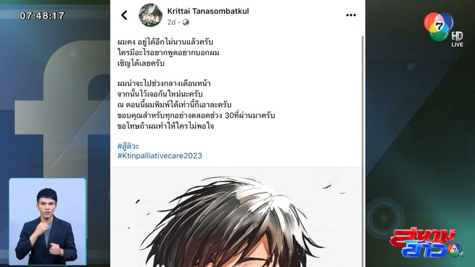 สนามข่าว 7 สี - ยังจำเรื่องราวของ นายแพทย์ กฤตไท หรือ คุณหมอไท หมอหนุ่มจากจังหวัดเชียงใหม่ ได้ไหม หลังจากเมื่อเดือนพฤศจิกายนปีที่แล้ว (2565) ออกมาเปิดเผยว่า ตนเองป่วยมะเร็งปอดระยะสุดท้าย ตอนอายุ 28 ปี คนแห่ให้กำลังใจล้นหลาม ซึ่งคุณหมอก็รักษาตัว และอัปเดตอาการตนเองผ่านเพจ "สู้ดิวะ" ที่สร้างขึ้นมาเพื่อแชร์ประสบการณ์ ล่าสุด คุณหมอโพสต์อำลา สั่งเสีย บอกว่า คงอยู่ได้อีกไม่นาน