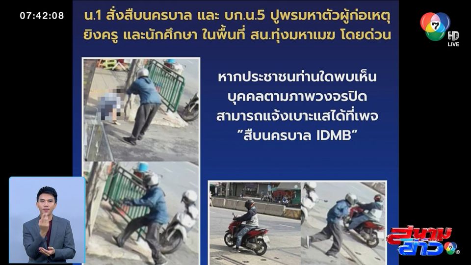 สนามข่าว 7 สี - ตามกันต่อกับเหตุการณ์ที่วัยรุ่นบุกยิงนักศึกษา มหาวิทยาลัยเทคโนโลยีราชมงคลตะวันออก วิทยาเขตอุเทนถวาย ได้รับบาดเจ็บ ขณะเดียวกันกระสุนปืนยังพลาดไปถูก นางสาวศิรดา อายุ 45 ปี หรือ "ครูเจี๊ยบ" ครูโรงเรียนพระหฤทัยคอนแวนต์ ที่กำลังเดินไปกดเงินหน้าตู้เอทีเอ็ม เสียชีวิต ซึ่งคดีนี้ตำรวจเชื่อว่าคนร้ายมีการวางแผนทำกันเป็นขบวนการ ก่อนลงมือก่อเหตุ