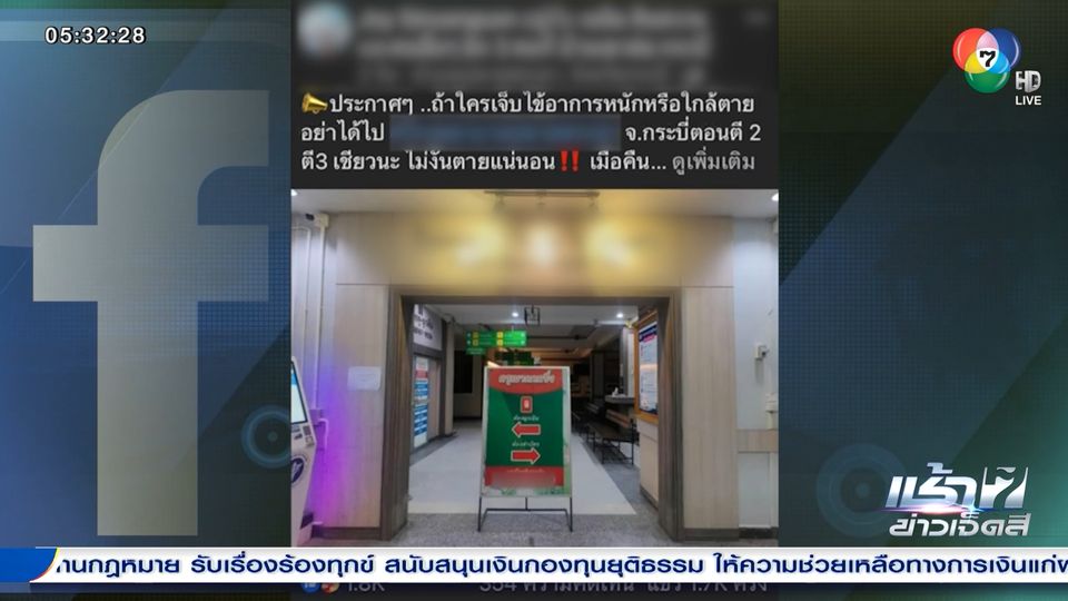 เช้าข่าว 7 สี - กรณีห้องฉุกเฉินโรงพยาบาลในจังหวัดกระบี่ ซึ่งมีผู้นำผู้ป่วยอาการค่อนข้างจะวิกฤต ไปหาหมอกลางดึก แต่ห้องฉุกเฉิน ไม่มีหมอ-พยาบาล อยู่ จนกลายเป็นกระแสดรามาในโลกโซเชียลมีเดีย สุดท้ายจบลงด้วยดี