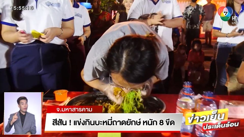 ข่าวเย็นประเด็นร้อน - ไม่รู้ว่าเอาไปเก็บไว้ส่วนไหน! ที่ จังหวัดมหาสารคาม มีการจัดแข่งกินบะหมี่ถาดยักษ์ หนัก 8 ขีด โดยให้เวลา 9 นาที แต่ผลปรากฏว่า ไม่ถึง 9 นาที ได้ผู้ชนะมาทั้งหมด 3 คน