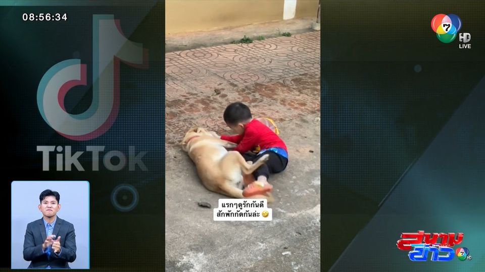 ผู้ใช้ TikTok รายนี้ เป็นคุณแม่ โพสต์คลิปขณะที่ลูกชายนอนเล่นกับเจ้าสุนัข แรก ๆ ก็ดูรักกันดี หยอกกันไปหยอกกันมา สุดท้ายสุนัขคงมันเขี้ยวจึงงับแขนลูก แต่ลูกชายก็ไม่ยอม สู้กลับ "แรก ๆ ก็รักกันดี สักพักกัดกันแล้ว"